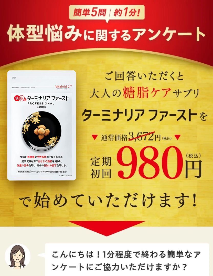 ■ターミナリアファースト プロフェッショナル4 機能性表示食品(届出番号 I128) 届出表示:本品にはターミナリアベリリカ由来没食子酸が含まれます。本品は、肥満気味な方のお腹の脂肪(内臓脂肪と皮下脂肪)を減らし、体重が減少するのを助け、高めのBMIが低下するのを助ける機能があります。また、ターミナリアベリリカ由来没食子酸には、食事の糖や脂肪の吸収を抑え、食後の血糖値や中性脂肪の上昇を抑える機能、尿酸値が高めの方の食事のプリン体による食後の尿酸値の上昇を抑える機能が報告されています。 ※本品は国の許可を受けたものではなく、消費者庁長官に必要事項を届け出ることで、届出者の責任の下、食品の容器包装に機能性表示をしております。 ※食生活の、主食、主菜、副菜をベースにした、食事バランスも重要です。 ※本品は、疾病の診断、治療、予防を目的としたものではありません。