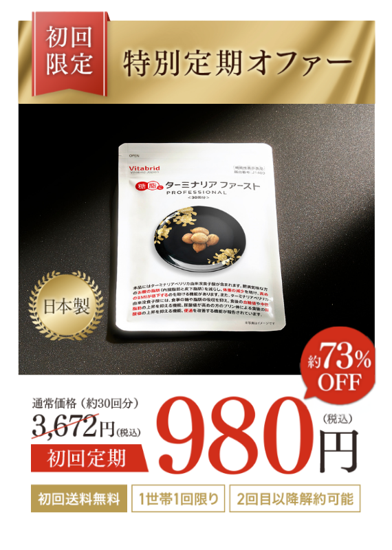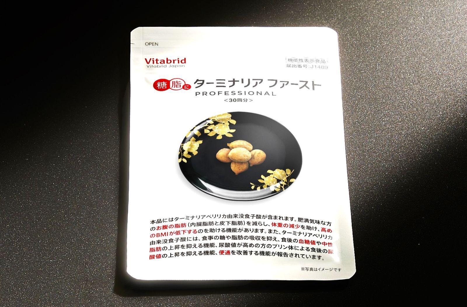 ■ターミナリアファースト プロフェッショナル5 機能性表示食品(届出番号J1489 ) 機能性表示: 本品にはターミナリアベリリカ由来没食子酸が含まれます。本品は、肥満気味な方のお腹の脂肪(内臓脂肪と皮下脂肪)を減らし、体重の減少を助け、高めのBMIが低下するのを助ける機能があります。ターミナリアベリリカ由来没食子酸には、食事の糖や脂肪の吸収を抑え、食後の血糖値や中性脂肪の上昇を抑える機能、尿酸値が高めの方の食事のプリン体による食後の尿酸値の上昇を抑える機能、便通を改善する機能が報告されています。