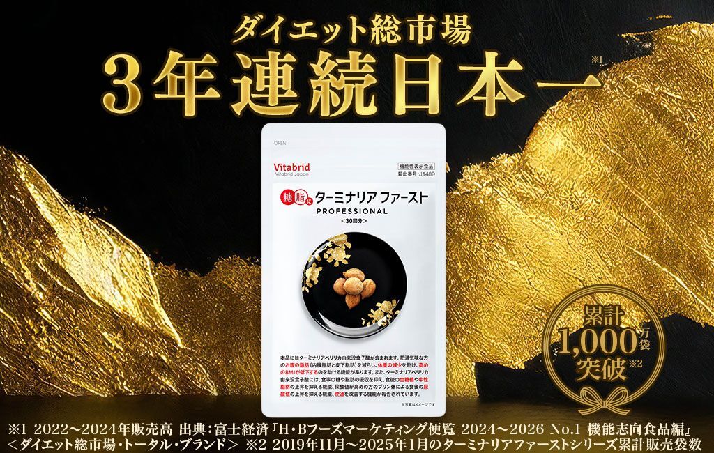 ※1 2022~2024年販売高 出典:富士経済『H・Bフーズマーケティング便覧 2024~2026 No.1 機能志向食品編』<ダイエット総市場・トータル・ブランド> ※2 ターミナリアベリリカ由来没食子酸の機能 ※3 肥満気味な方の *内臓脂肪と皮下脂肪のこと
